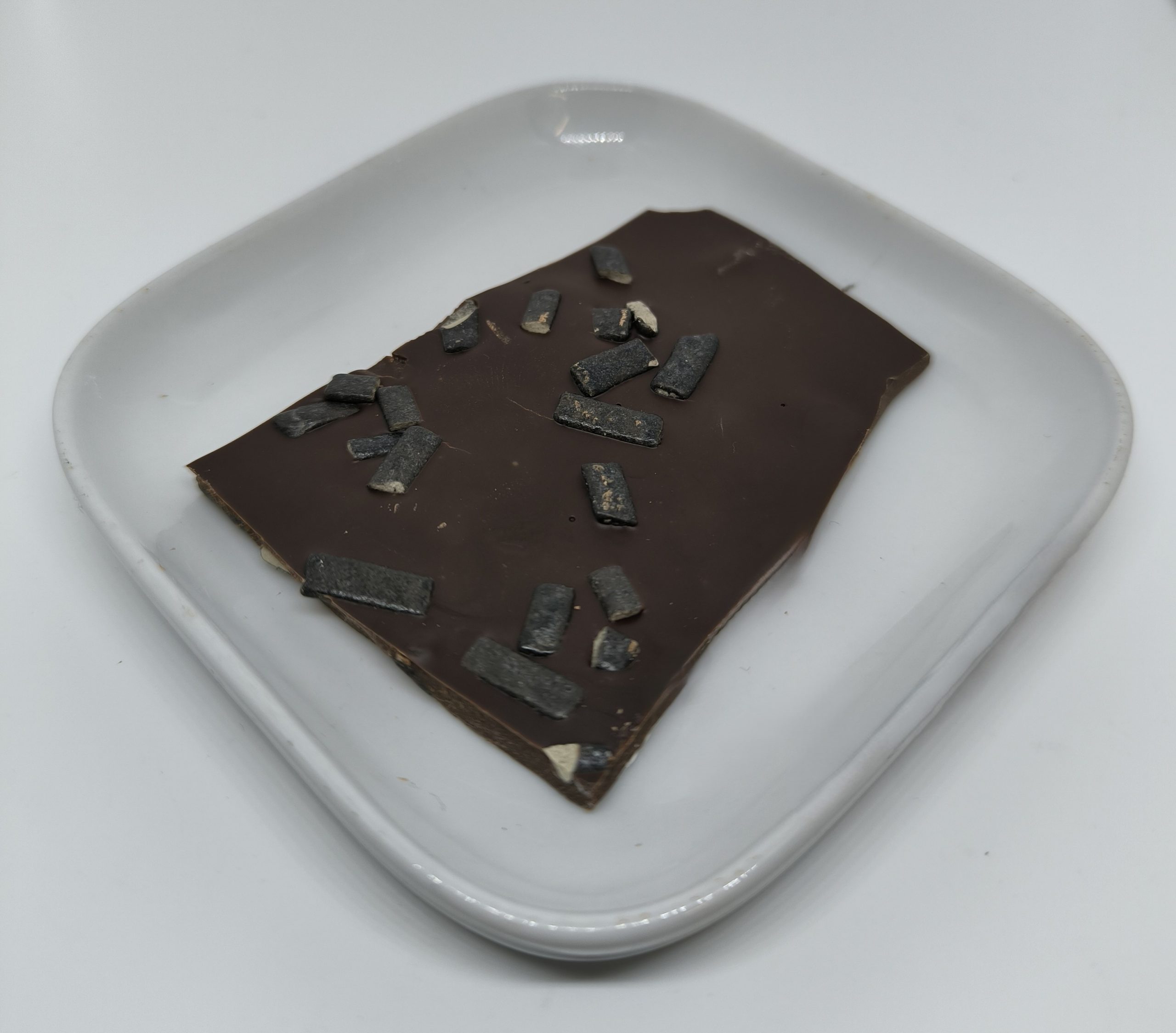 Zartbitterschokolade mit kräftig viel Salmiak und salzigen Lakritzstreusel. Wenn es etwas stärker sein darf: Greif zu !