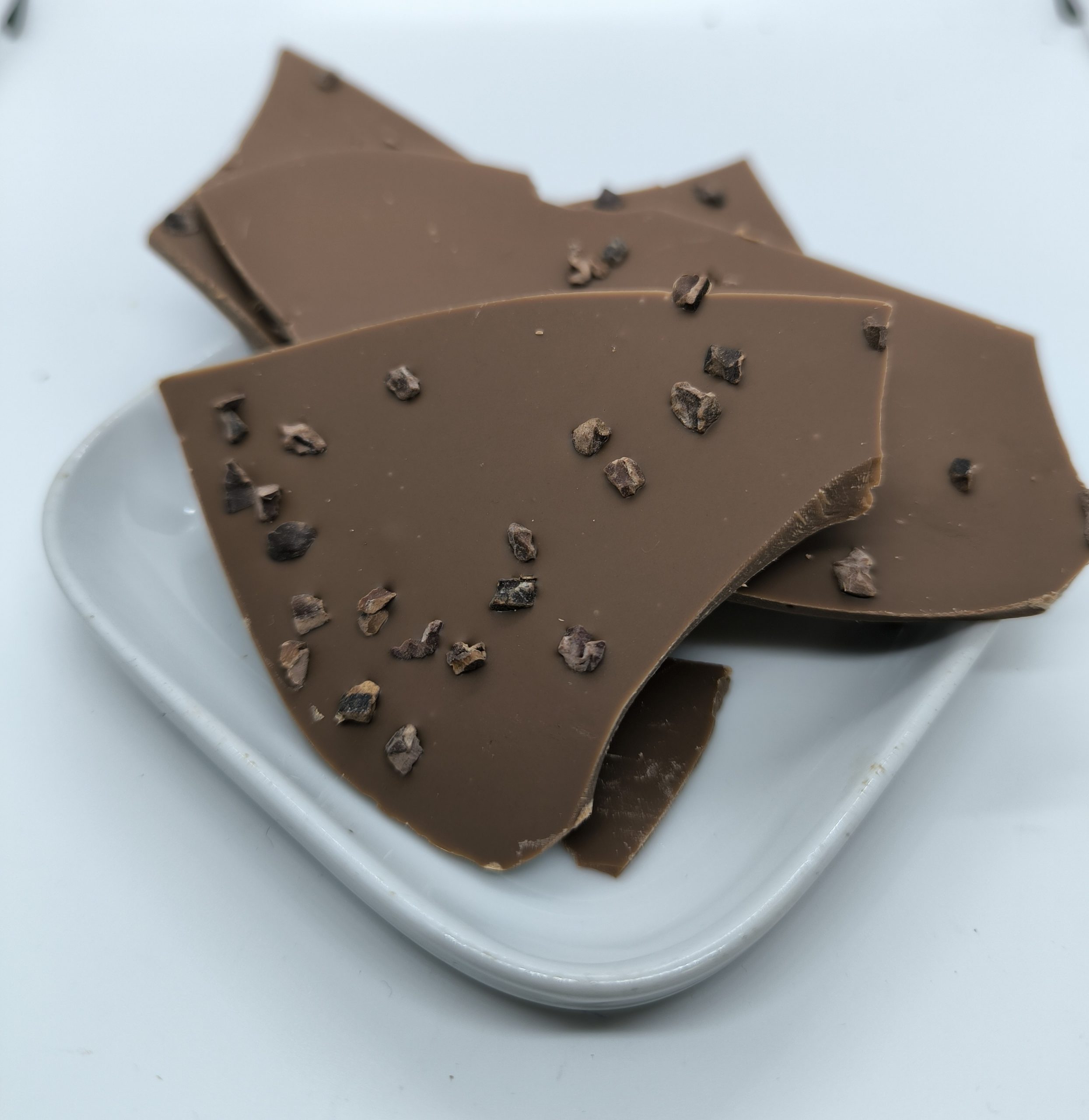 Cremige Vollmilchschokolade mit fruchtiger Orange und knackigen Kakaonibs – fruchtig, schokoladig und leicht herb.